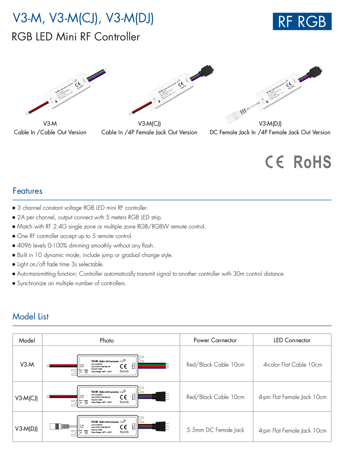 3CH*2A 12-24VDC RGB LED Mini RF Controller V3-M