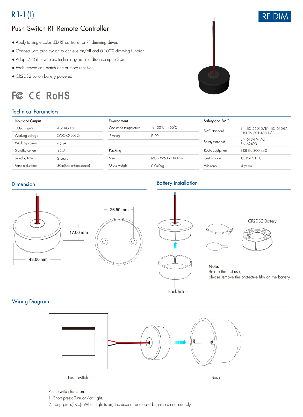 1 Zone Push Switch Dimming Remote Control R1-1(L)