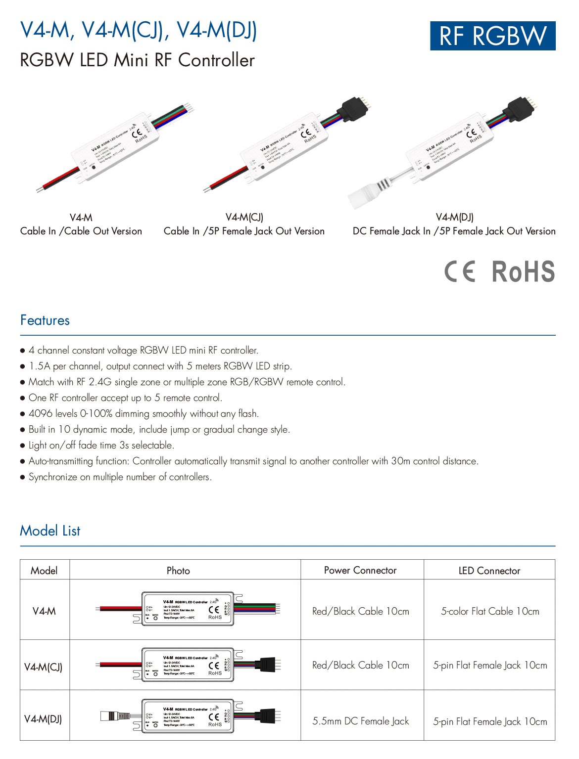 4CH*1.5A 12-24VDC RGBW LED Mini RF Controller V4-M
