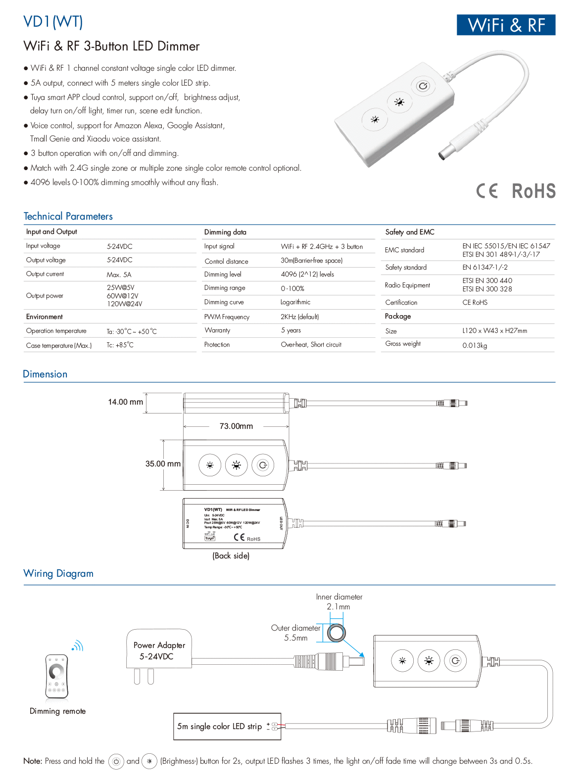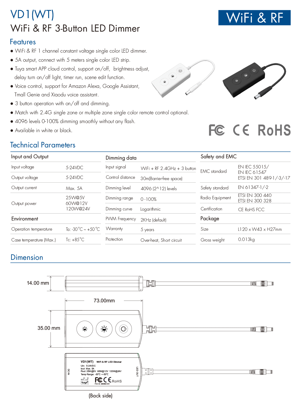 1CH*5A 5-24VDC WiFi & RF CV Controller VD1(WT) (Tuya App)
