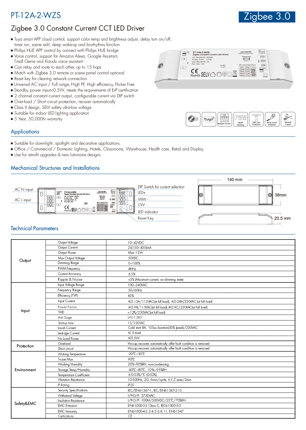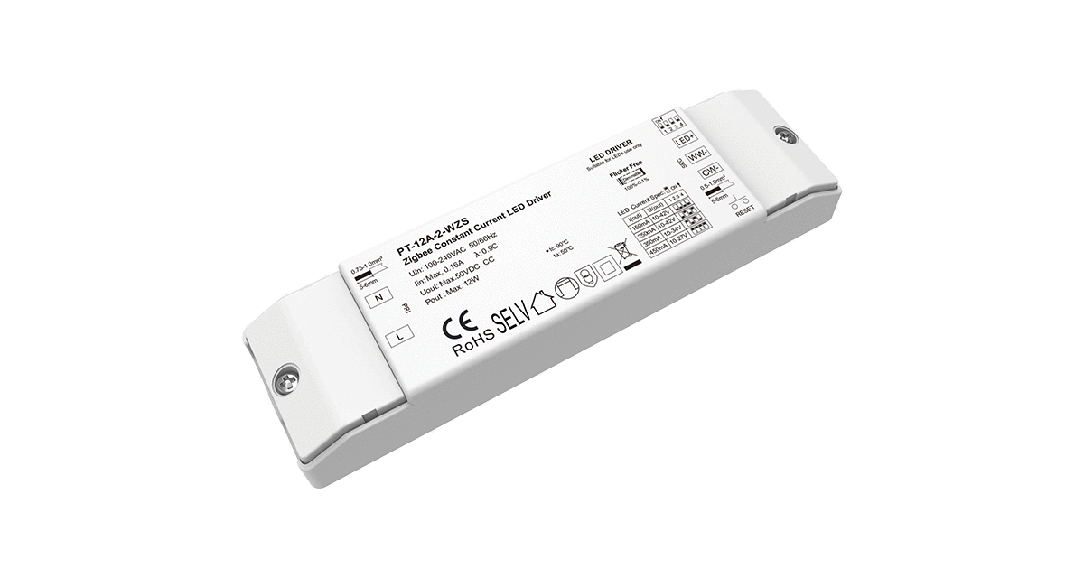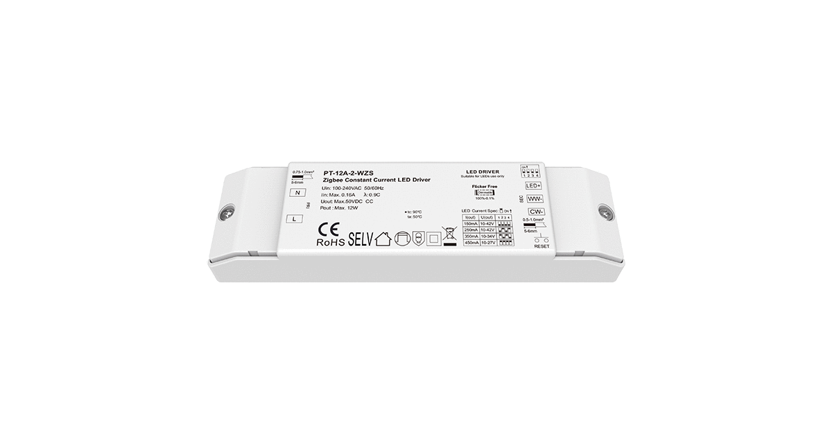 10-42VDC 2CH*(150-450mA) 12W Zigbee CCT Constant Current LED Driver PT-12A-2-WZS