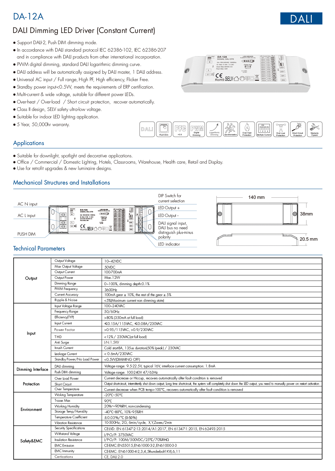 12W 100-700mA DALI Dimmable LED Driver DA-12A