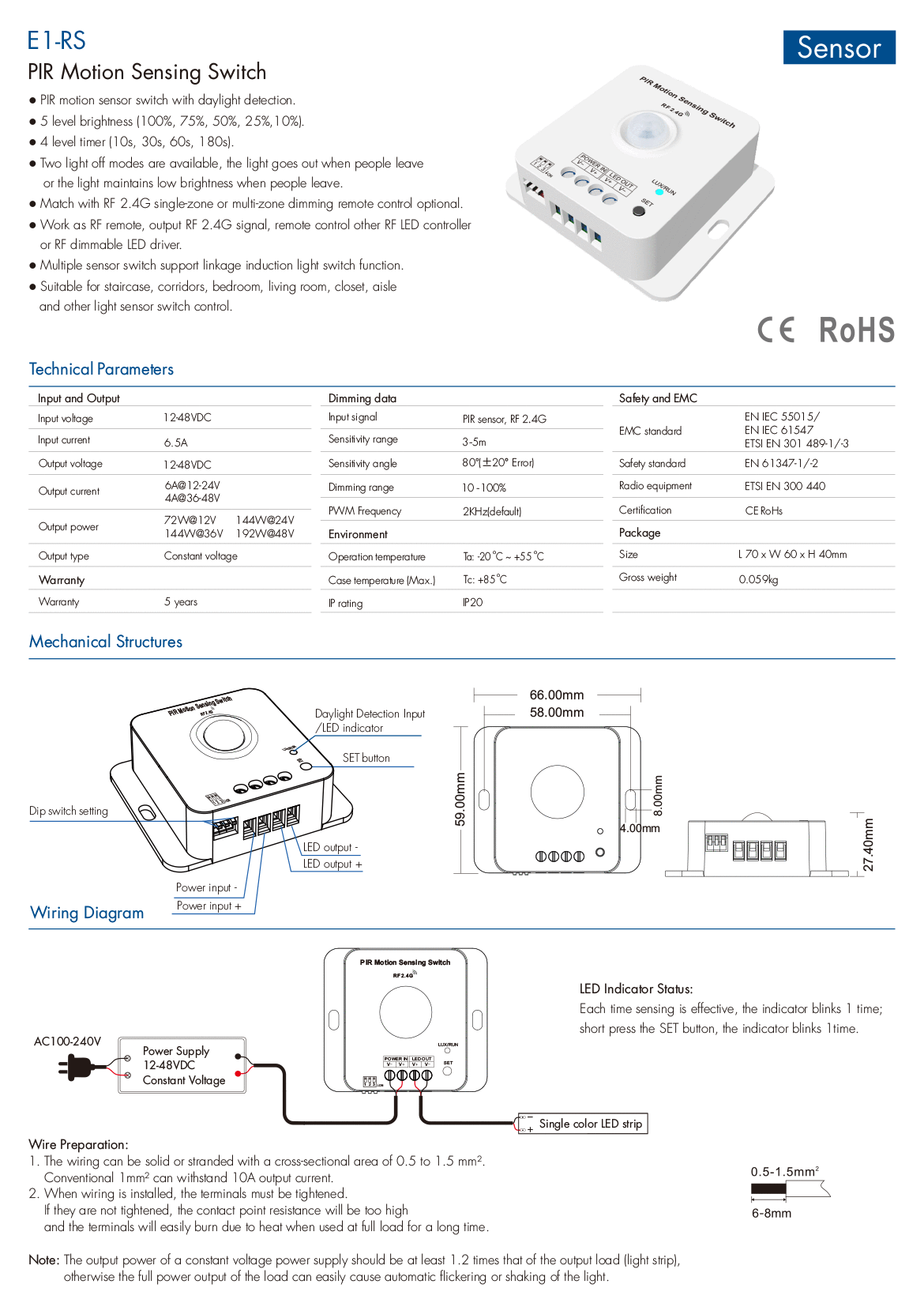 12-48VDC 6A PIR Motion Sensing Switch E1-RS