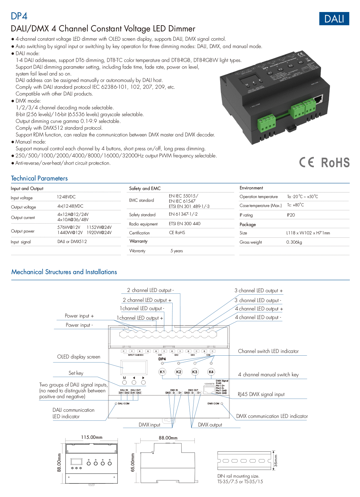 4CH*12A 12-48VDC DALI/DMX Constant Voltage DALI LED Dimmer DP4(DT6/DT8)
