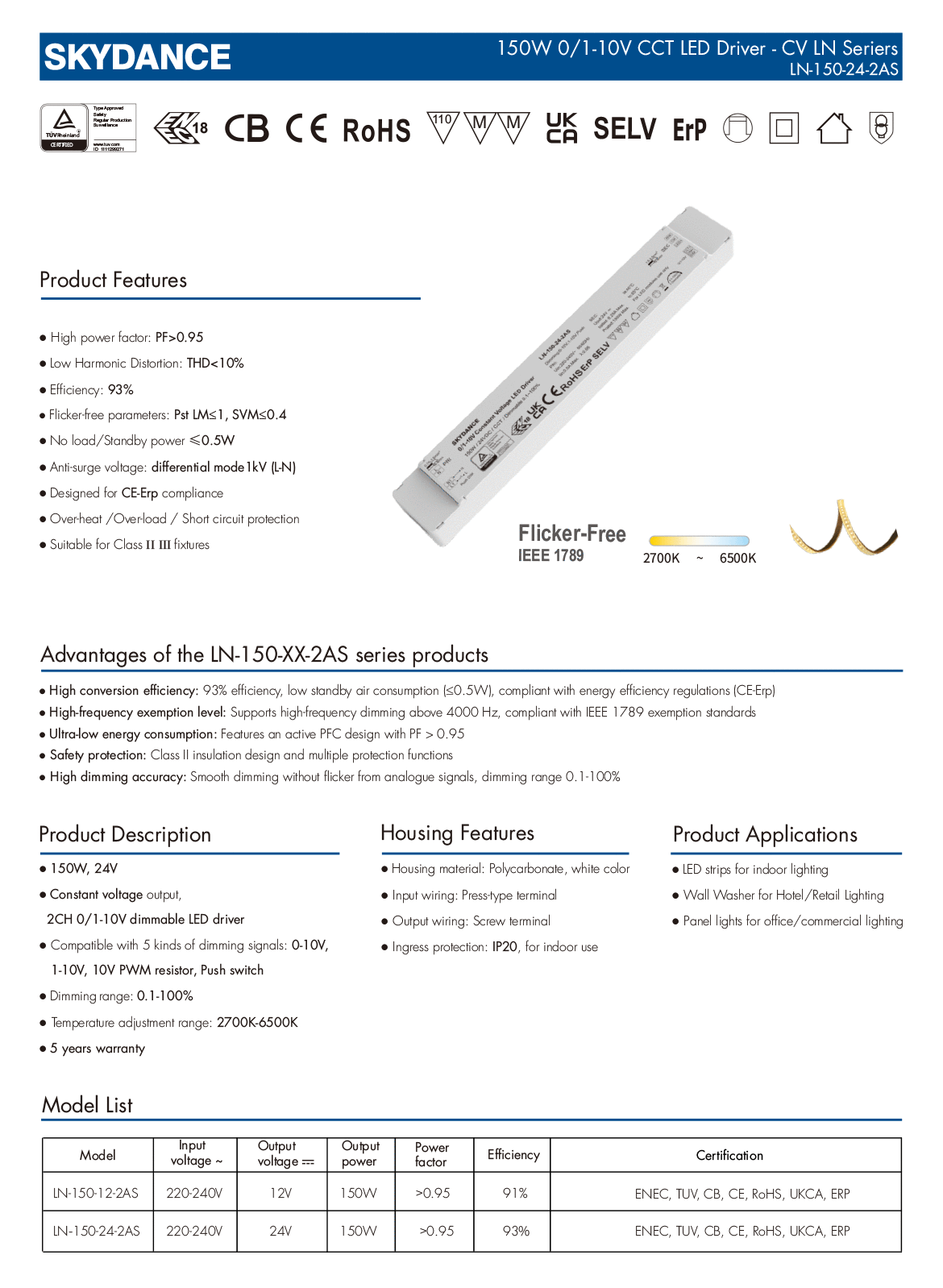 150W 24V 0/1-10V CCT LED Driver LN-150-24-2AS