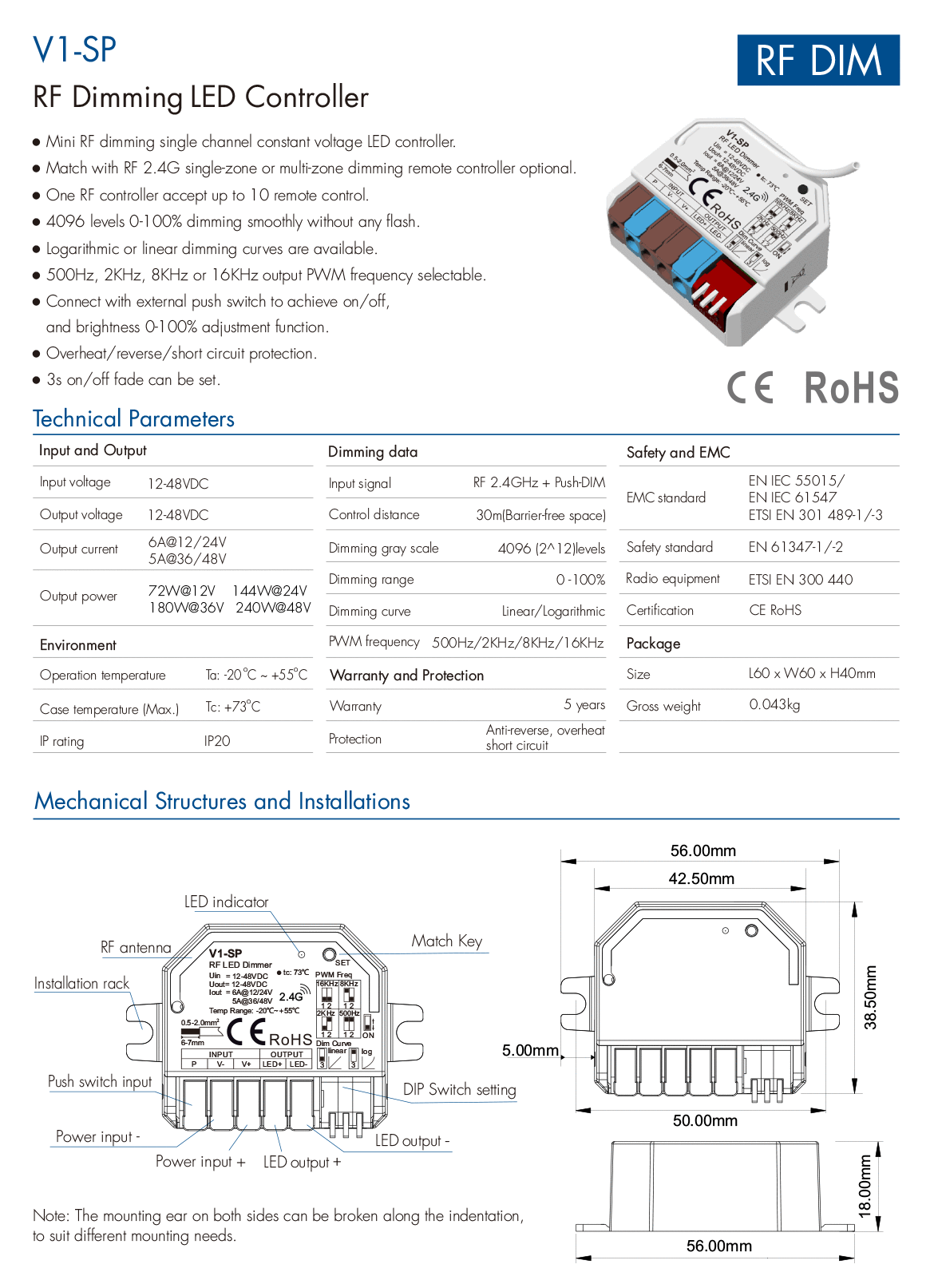1CH*6A 12-48VDC CV Controller, Push-Dim V1-SP