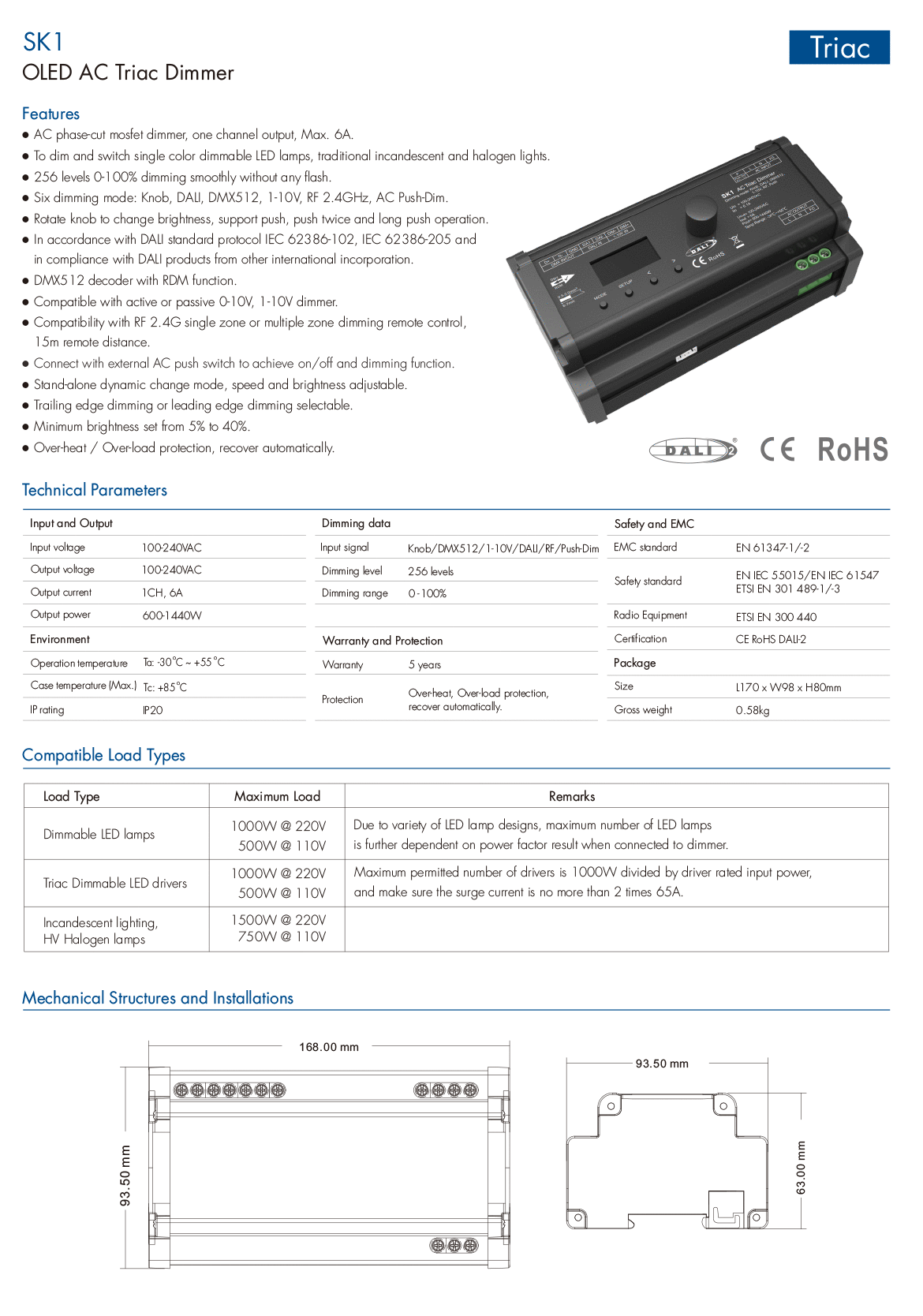 600-1440W 100-240VAC RF AC Triac Dimmer (Knob, DALI, DMX512, 1-10V) SK1(DT4)