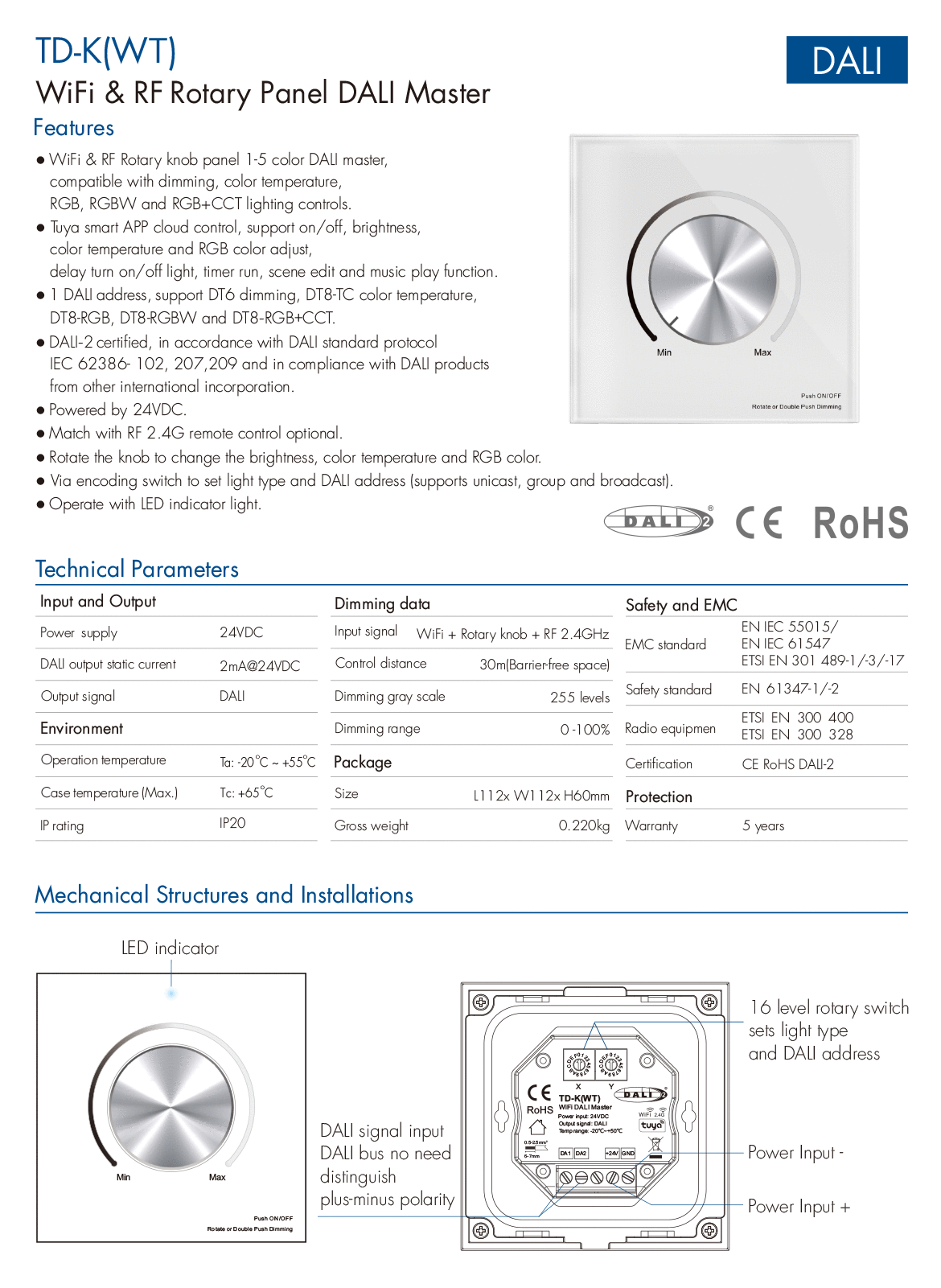 24VDC 1CH*2mA WiFi & RF Rotary Panel DALI Master TD-K(WT)(Tuya App)