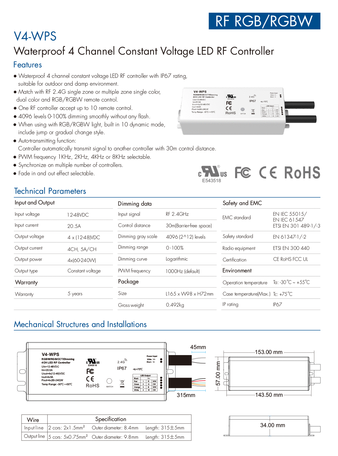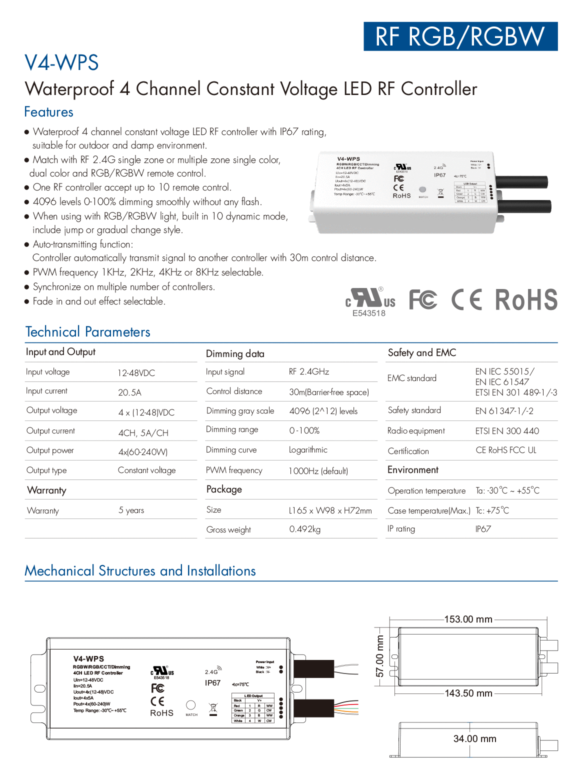4CH*5A 12-48VDC IP67 Waterproof Controller V4-WPS (UL Certified)