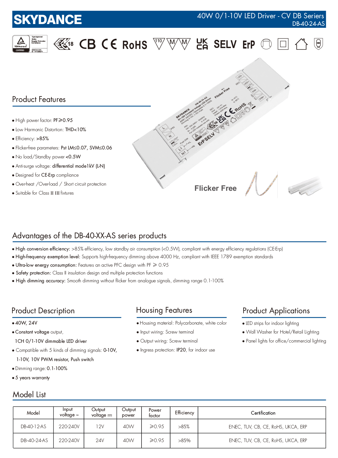 40W 24V 0/1-10V Dimmable LED Driver DB-40-24-AS