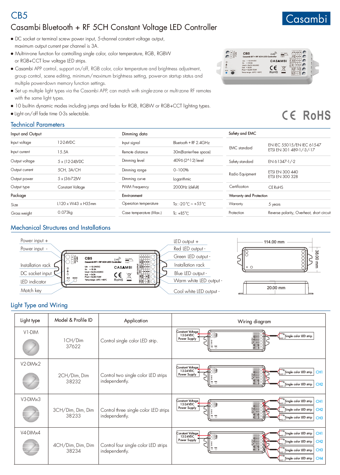 5CH*3A 12-24VDC Casambi Bluetooth + RF CV Controller CB5