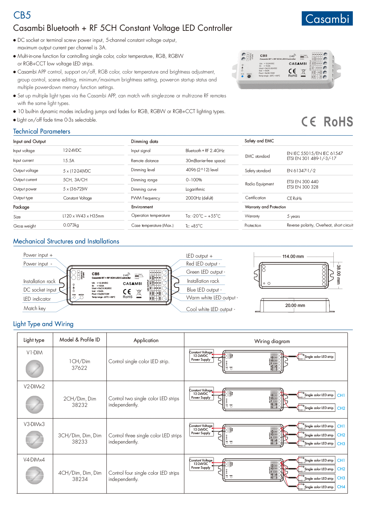 5CH*3A 12-24VDC Casambi Bluetooth + RF CV Controller CB5