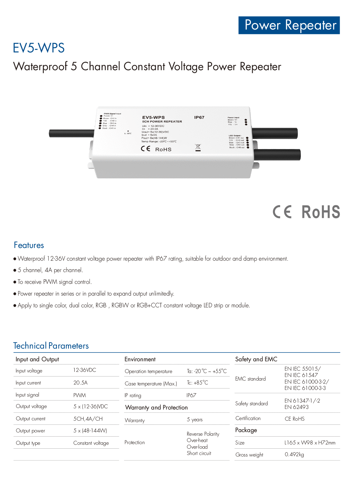 5CH*4A 12-36VDC CV IP67 Waterproof Power Repeater EV5-WPS