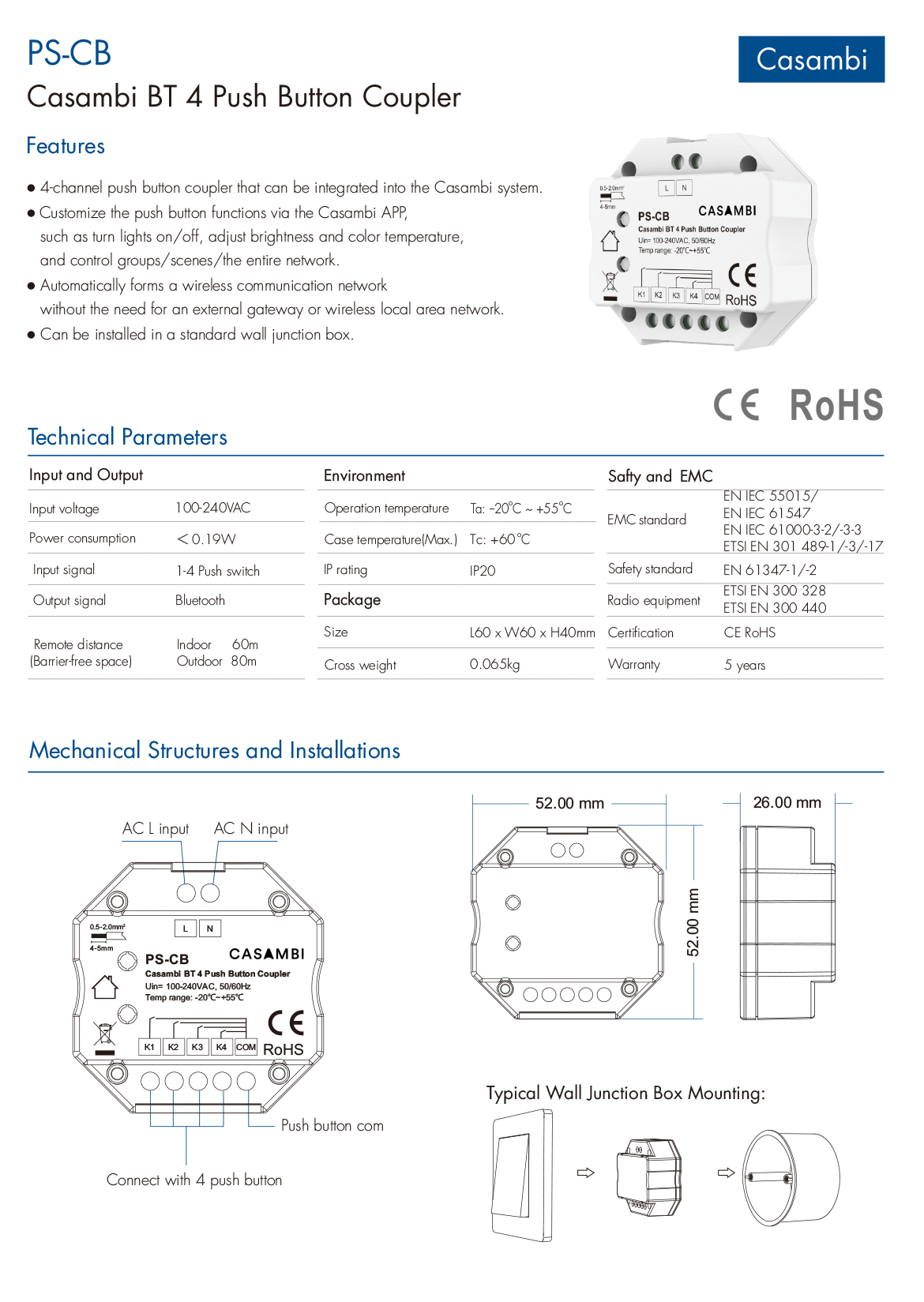 100-240VAC Casambi BT 4 Push Button Coupler PS-CB