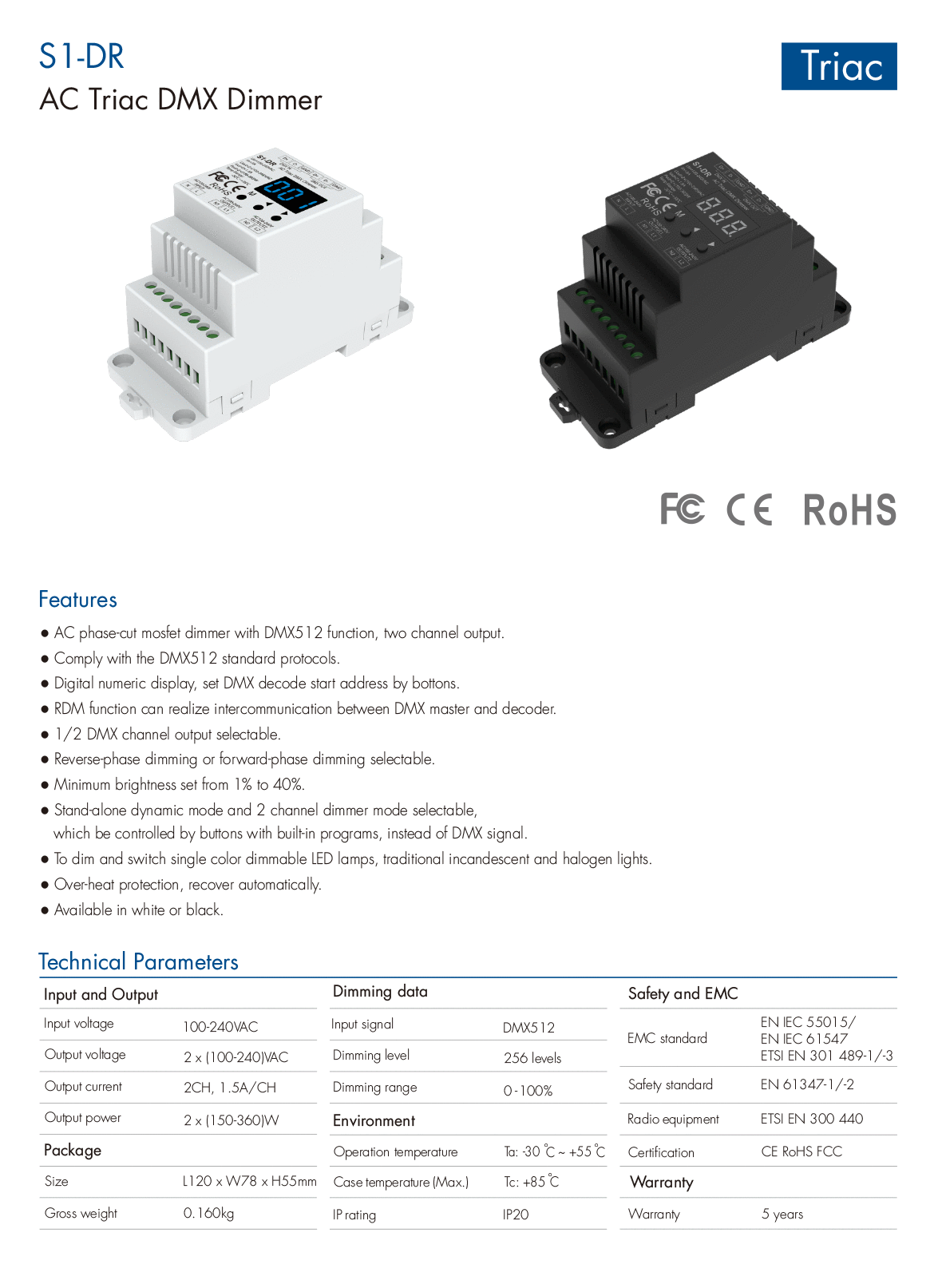 2CH*1.5A AC Phase-cut DMX Dimmer S1-DR