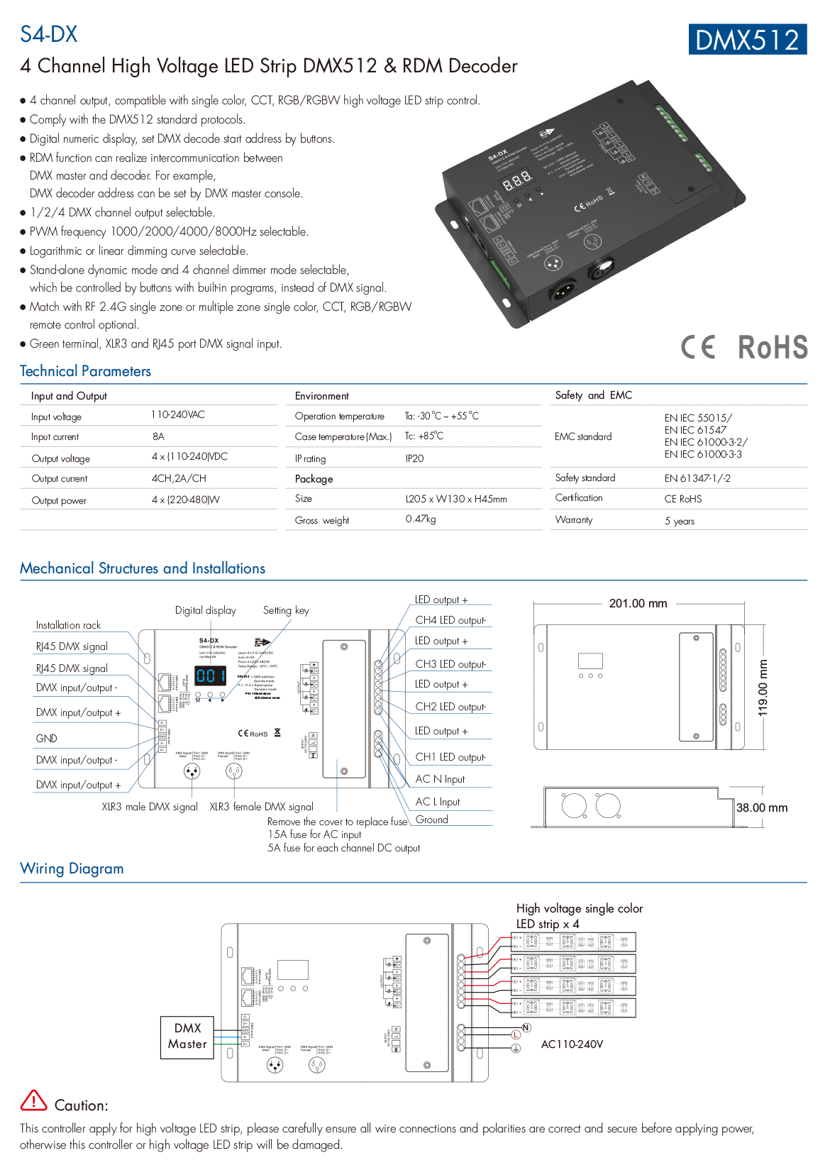 4CH*2A 110-240VAC High Voltage LED Strip DMX Decoder (with RF) S4-DX