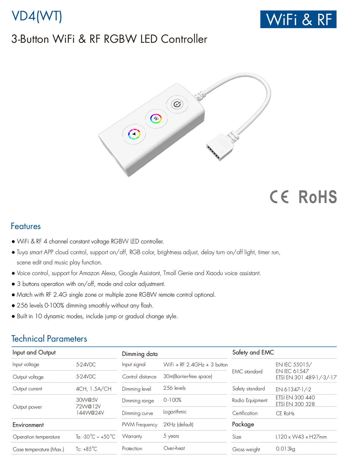 4CH*1.5A 5-24VDC WiFi & RF CV Controller VD4(WT) (Tuya App)
