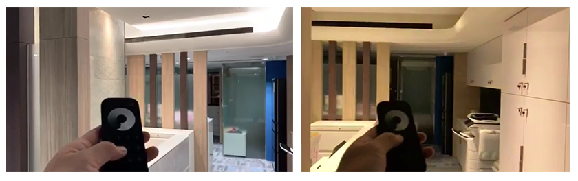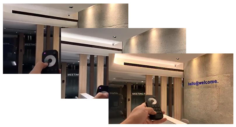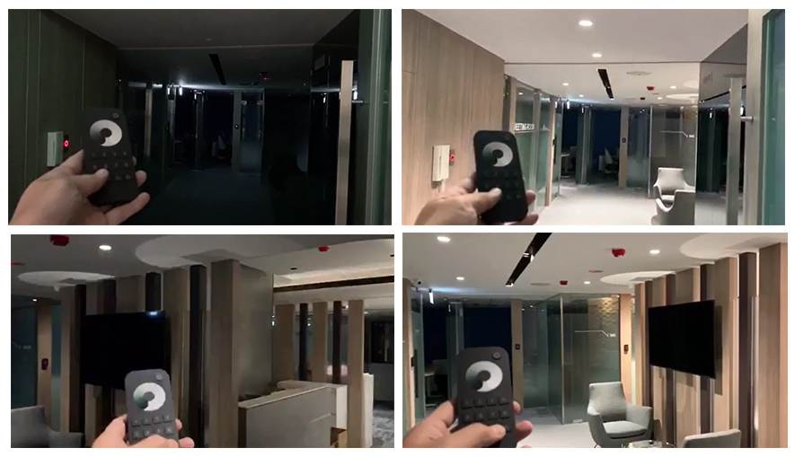 Remote control RT8 has 8 zone keys, which support 8 lights zones through matching with LED controller V1. In this project, the office was divided for 8 lighting zones of lobby, reception,corridor, rest room, office, etc.