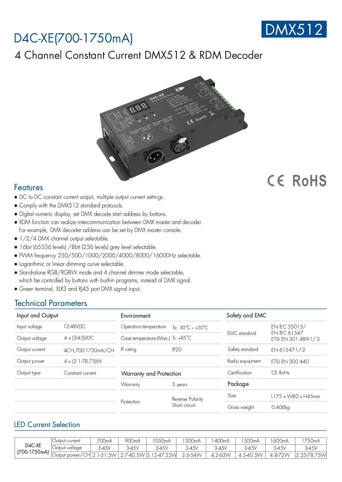 4CH Constant Current DMX512 & RDM Decoder D4C-XE(700-1750mA)