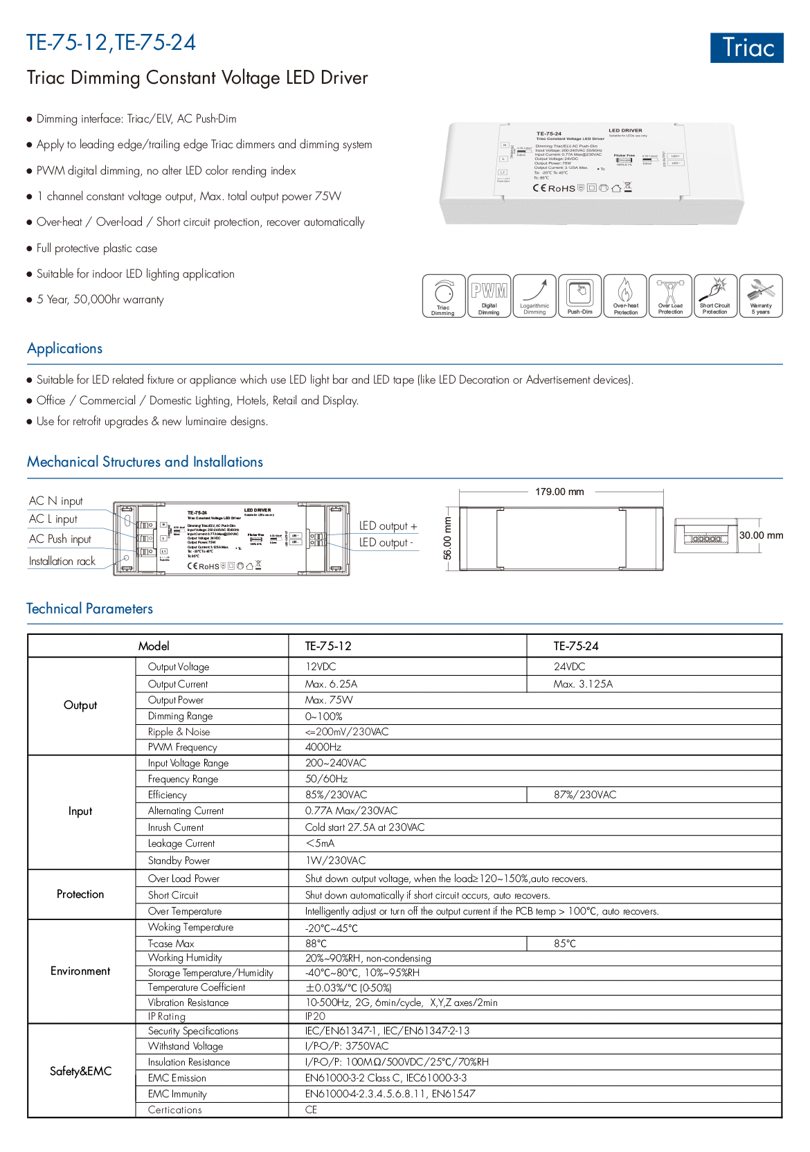 75W 24V Triac Dimmable LED Driver TE-75-24