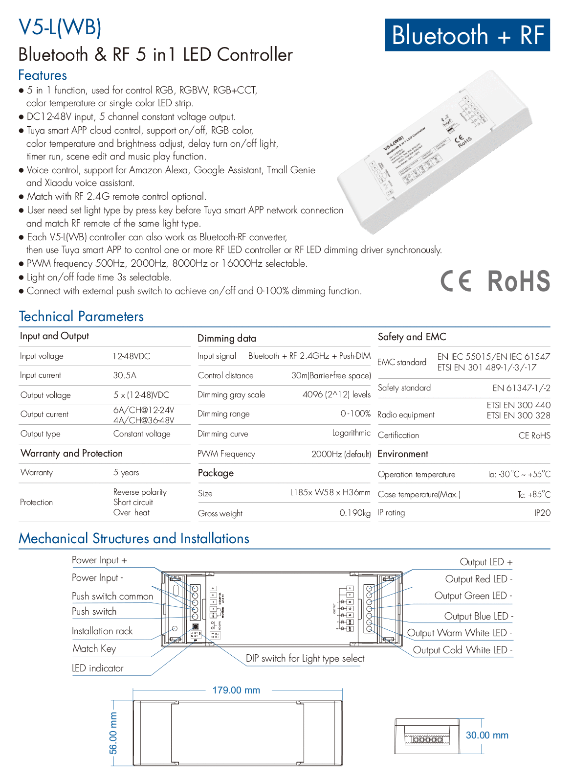 12-48VDC 5CH*6A Bluetooth & RF 5 in 1 LED Controller V5-L(WB) (Tuya App)