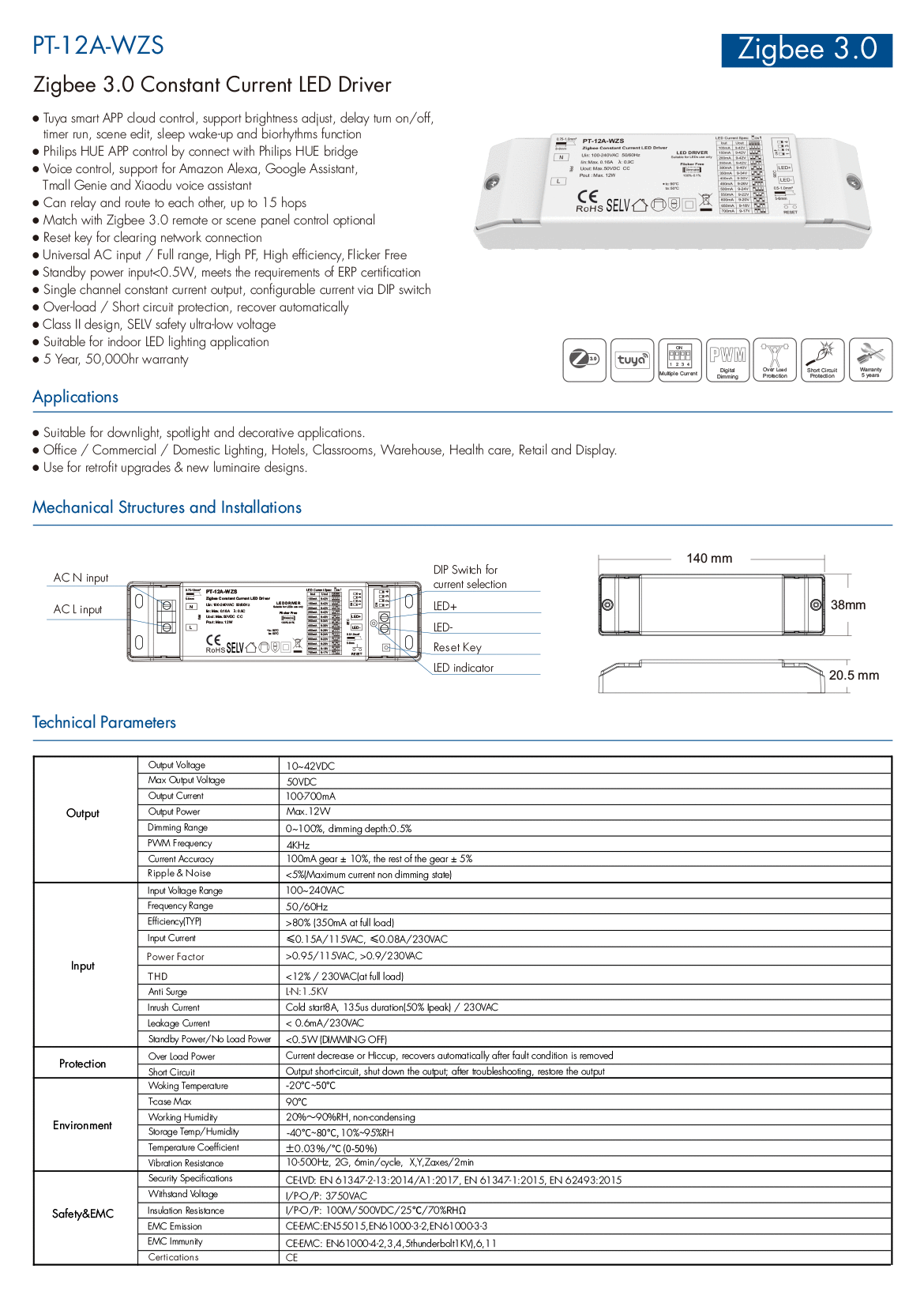 10-42VDC 1CH*(100-700mA) 12W Zigbee Constant Current LED Driver PT-12A-WZS
