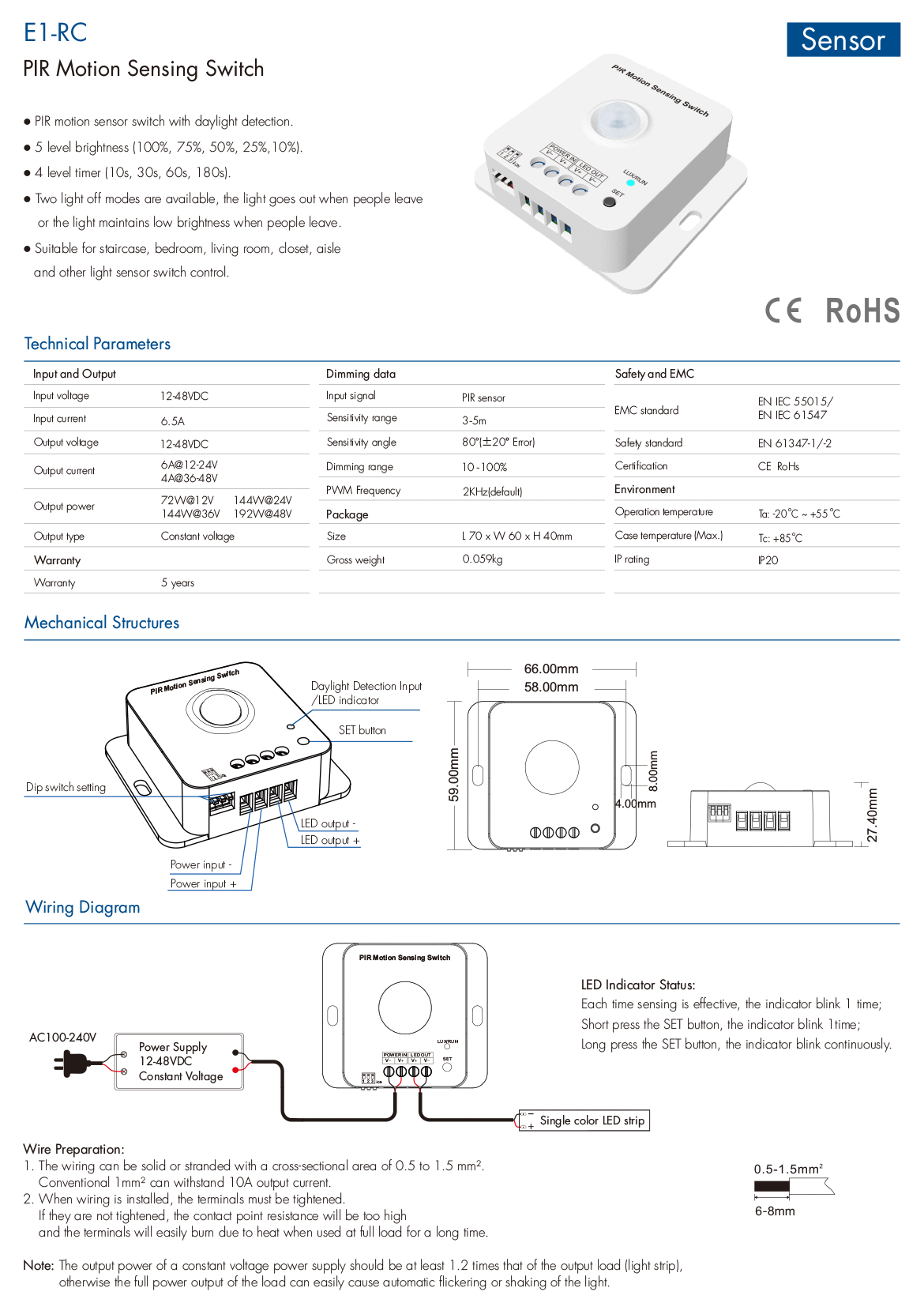12-48VDC 6A PIR Motion Sensing Switch(without RF) E1-RC