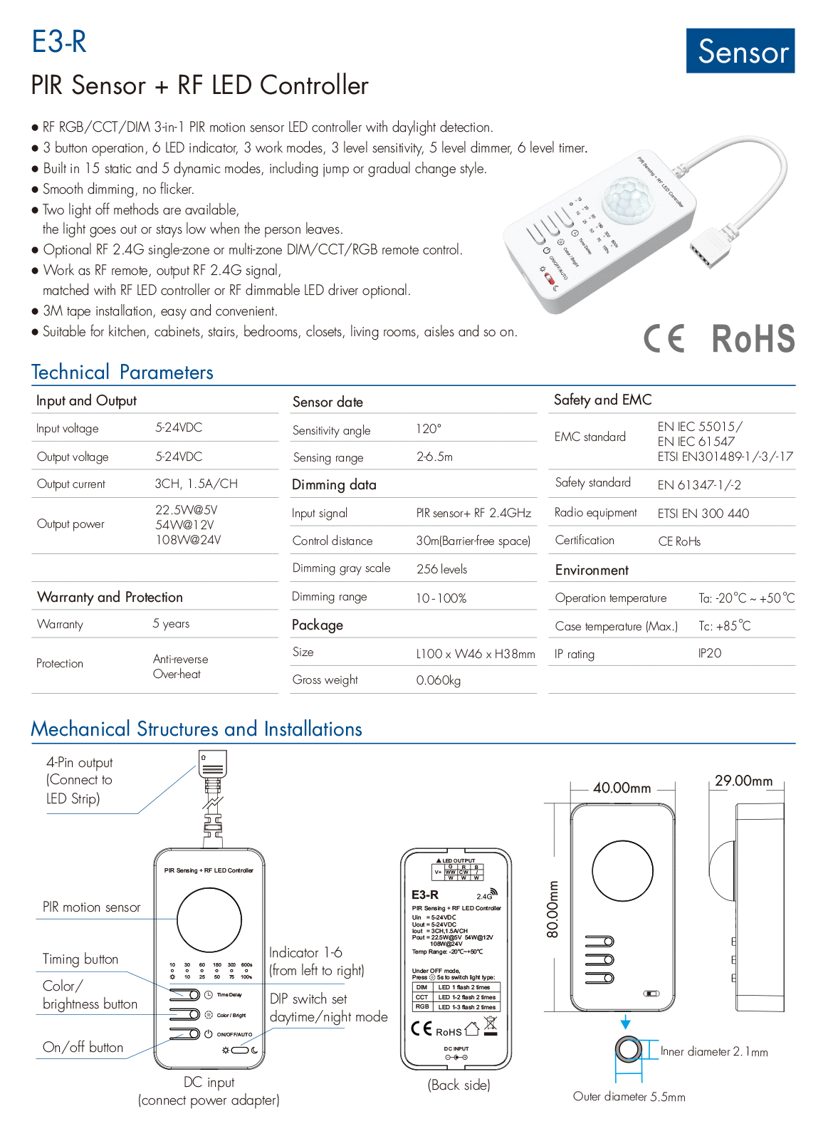 5-24VDC 3CH*1.5A PIR + RF LED Controller E3-R