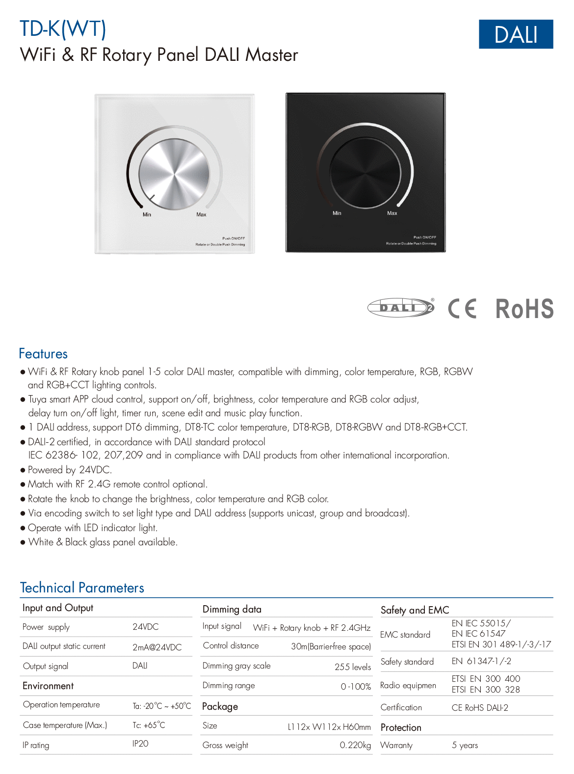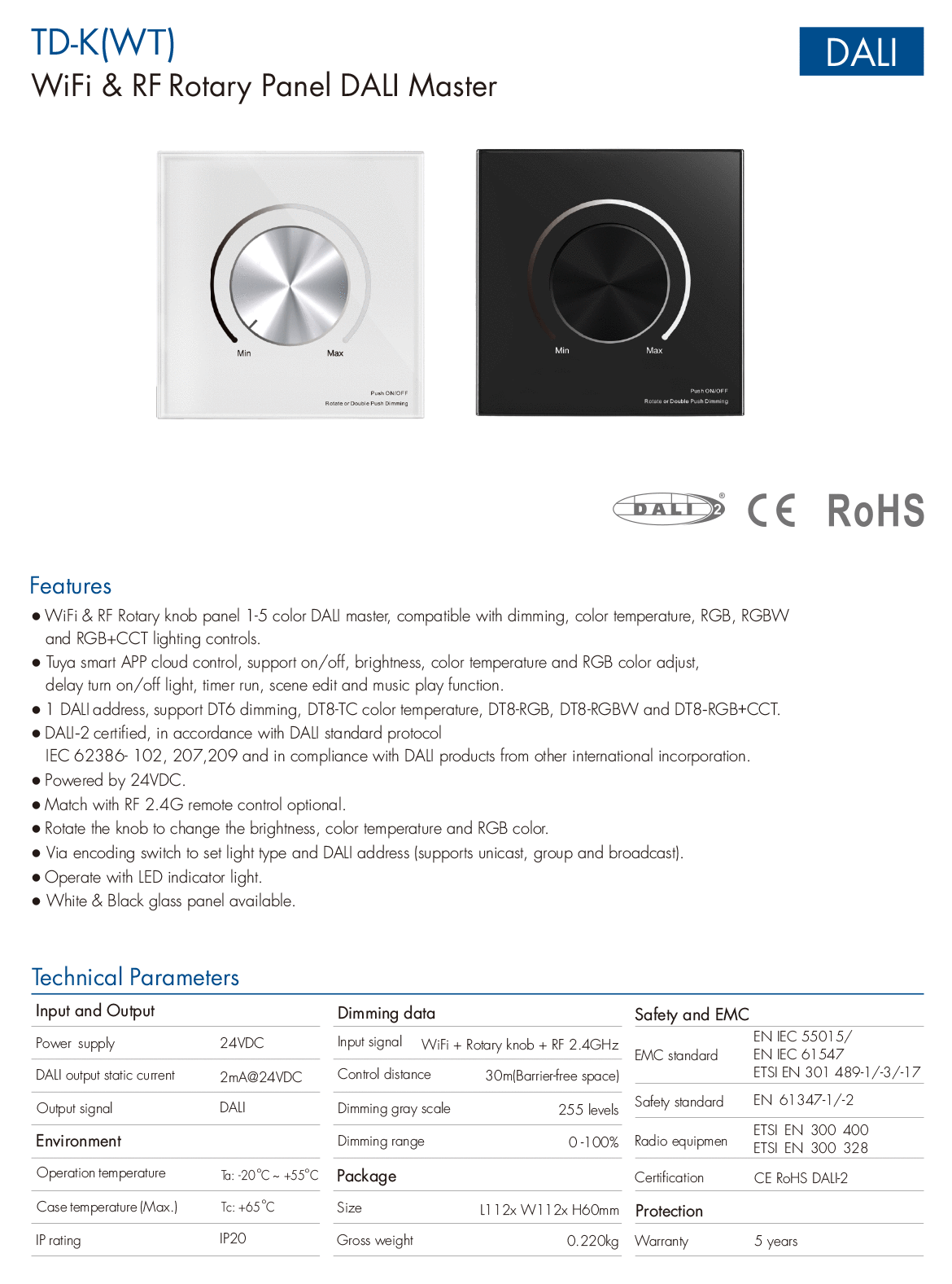 24VDC 1CH*2mA WiFi & RF Rotary Panel DALI Master TD-K(WT)(Tuya App)