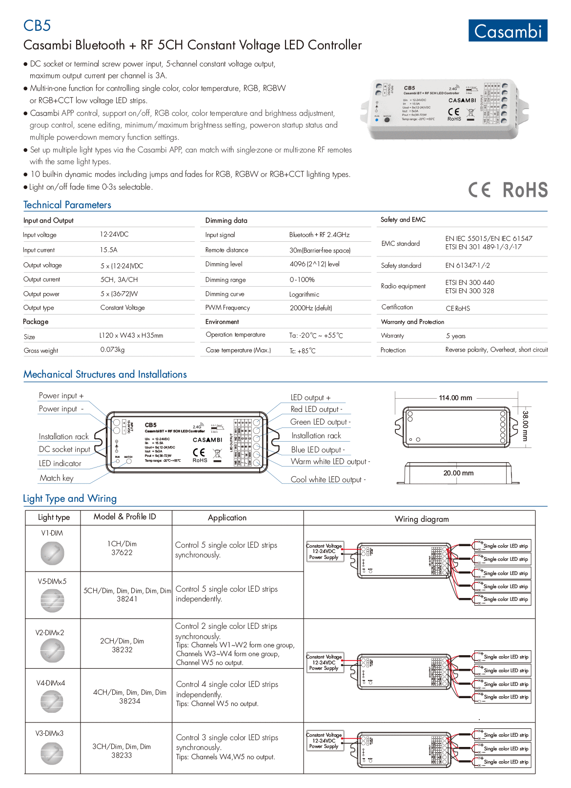 5CH*3A 12-24VDC Casambi Bluetooth + RF CV Controller CB5