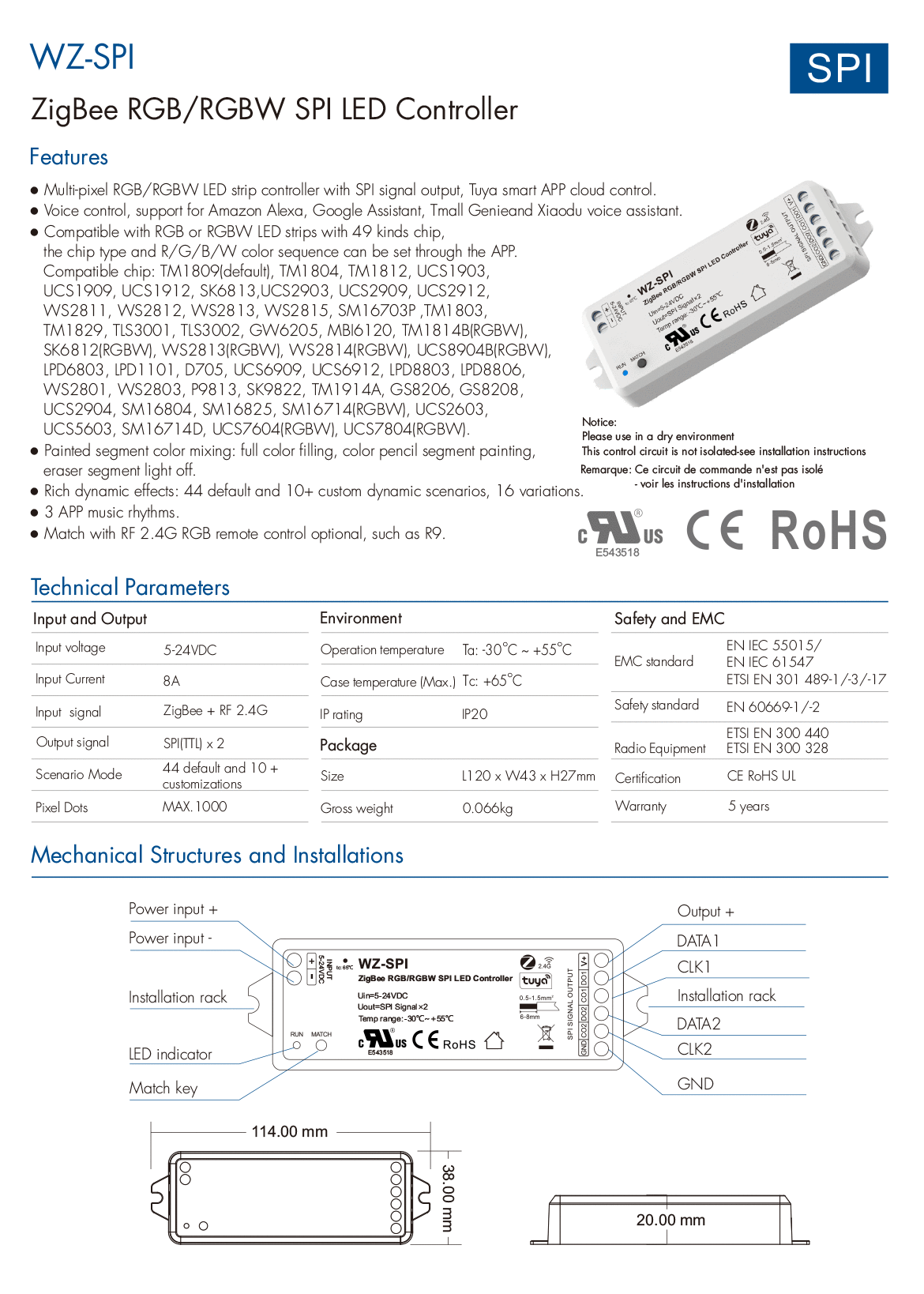 5-24VDC Zigbee & RF RGB/RGBW SPI LED Controller WZ-SPI (UL Certified) (Tuya App)