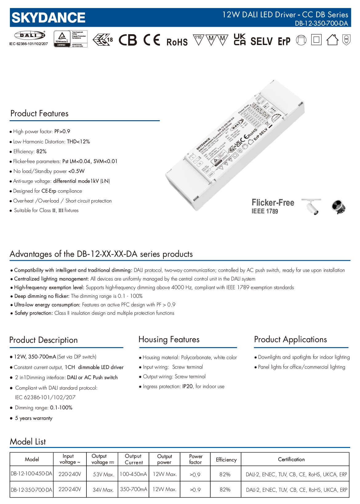 12W 350-700mA DALI Dimmable LED Driver DB-12-350-700-DA