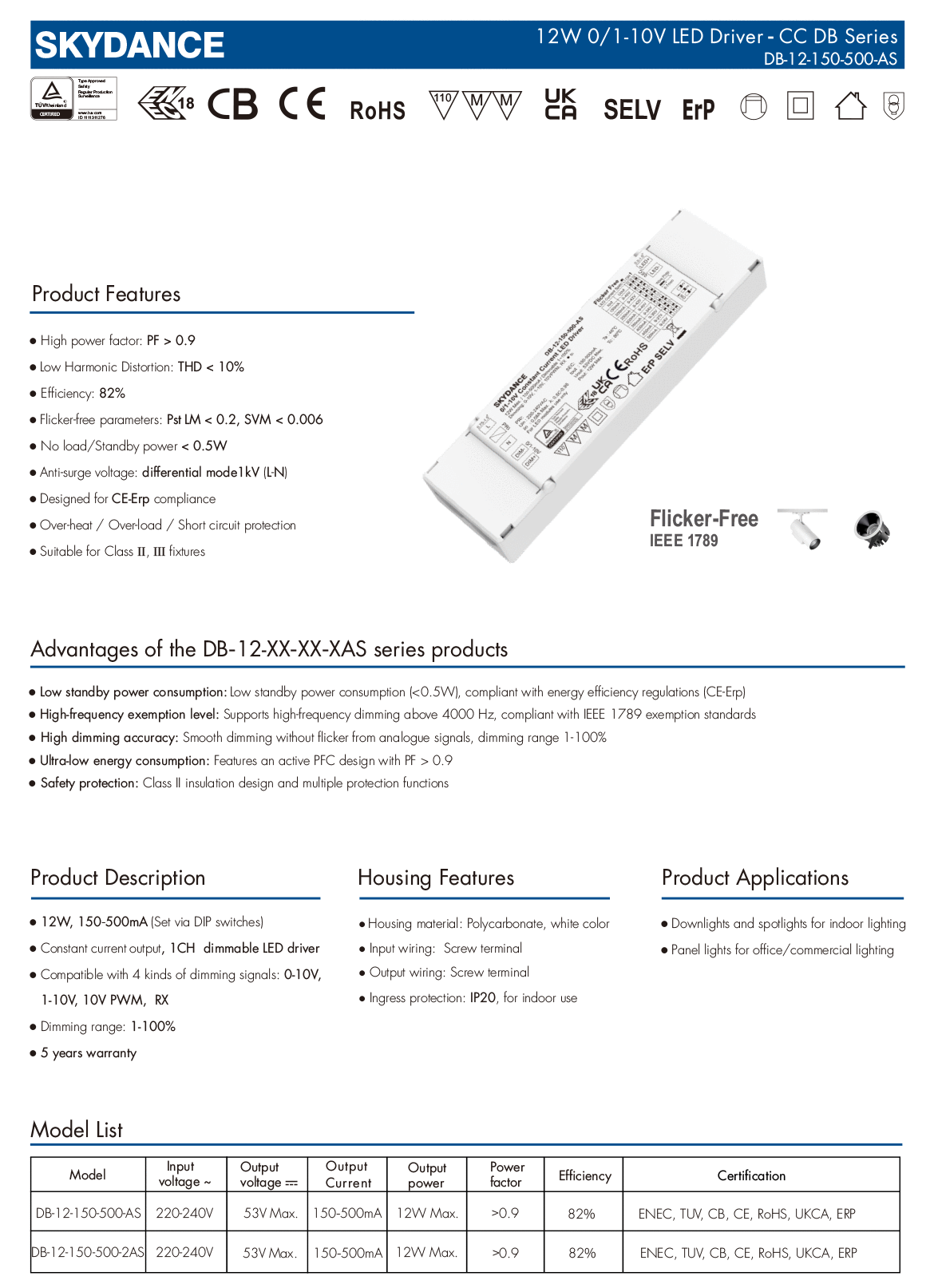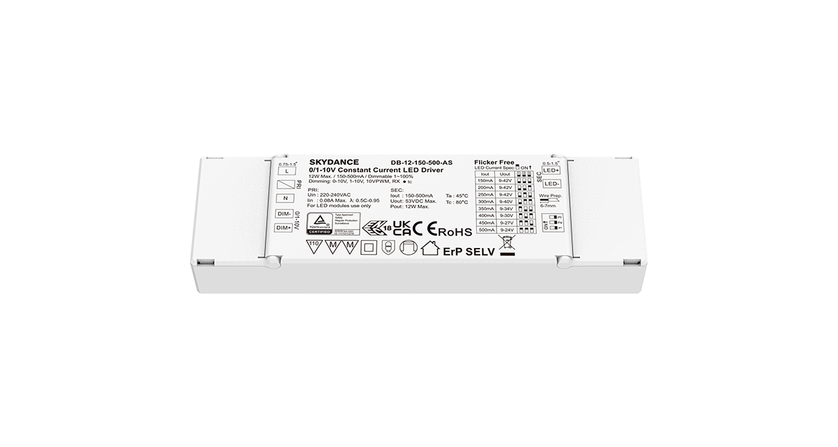12W 150-500mA 0/1-10V Dimmable LED Driver DB-12-150-500-AS