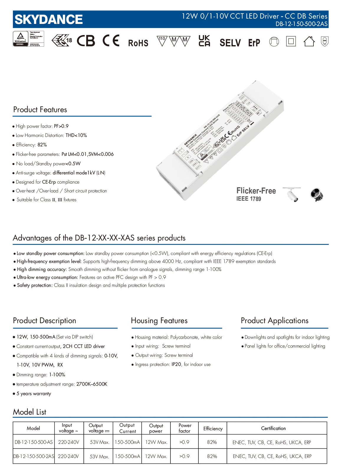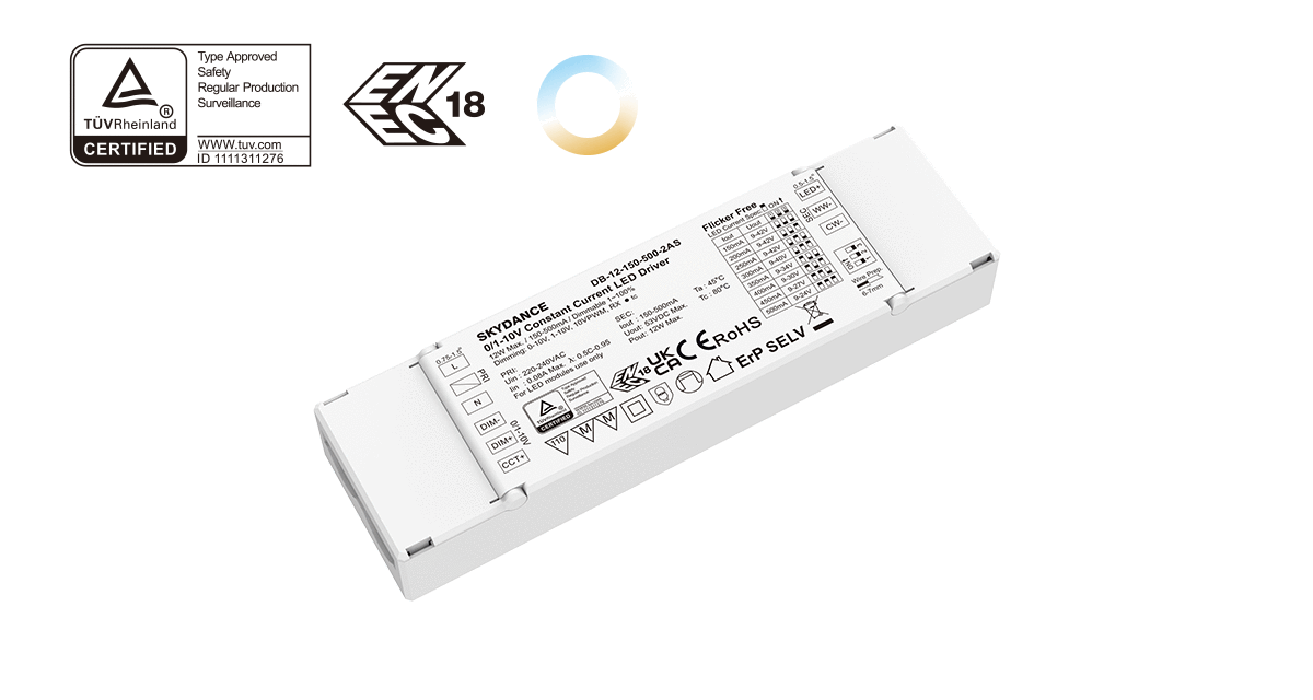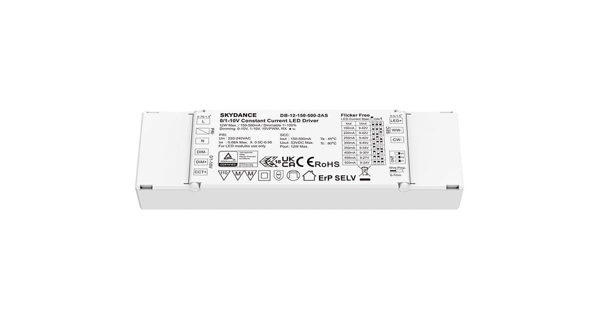 12W 100-500mA 0/1-10V CCT LED Driver DB-12-150-500-2AS