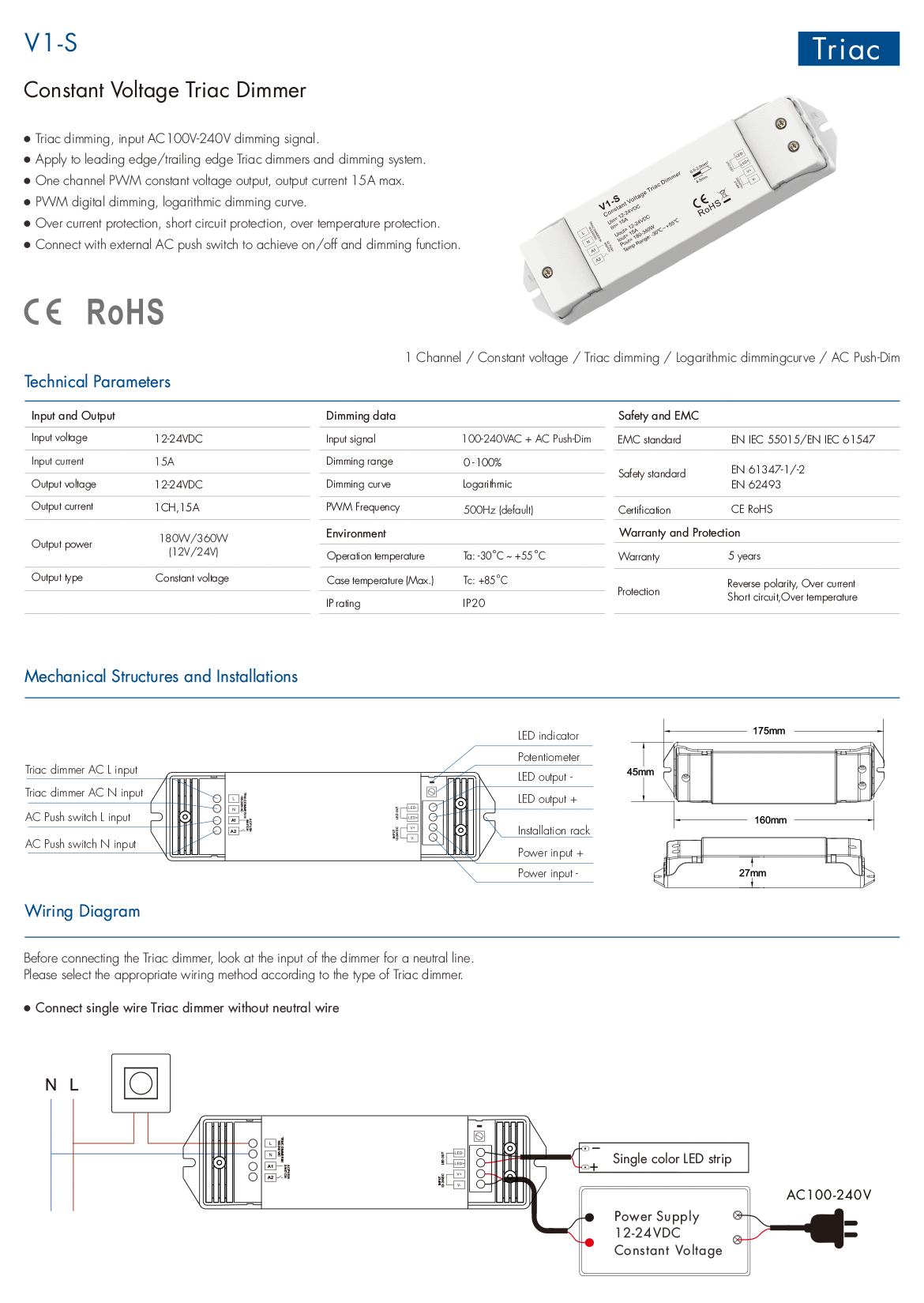 1CH*15A CV Triac Dimming Controller V1-S